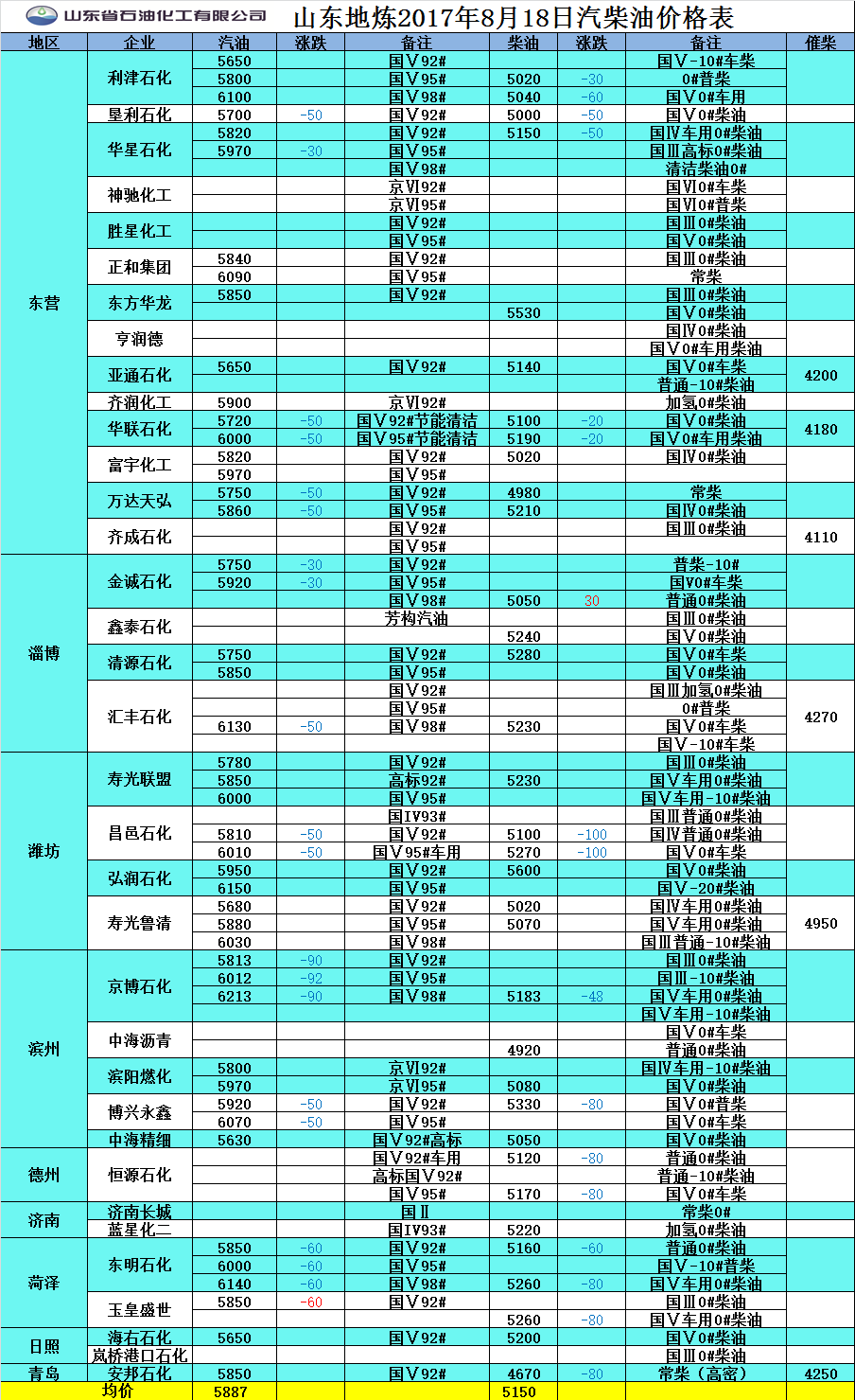 山東地?zé)?017年8月18日汽柴油價(jià)格表