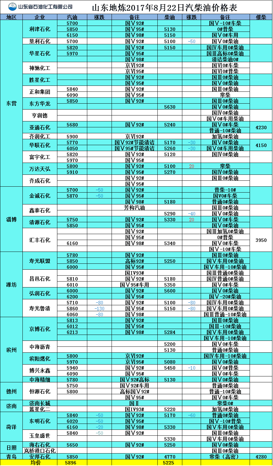 山東地?zé)?017年8月22日汽柴油價(jià)格表