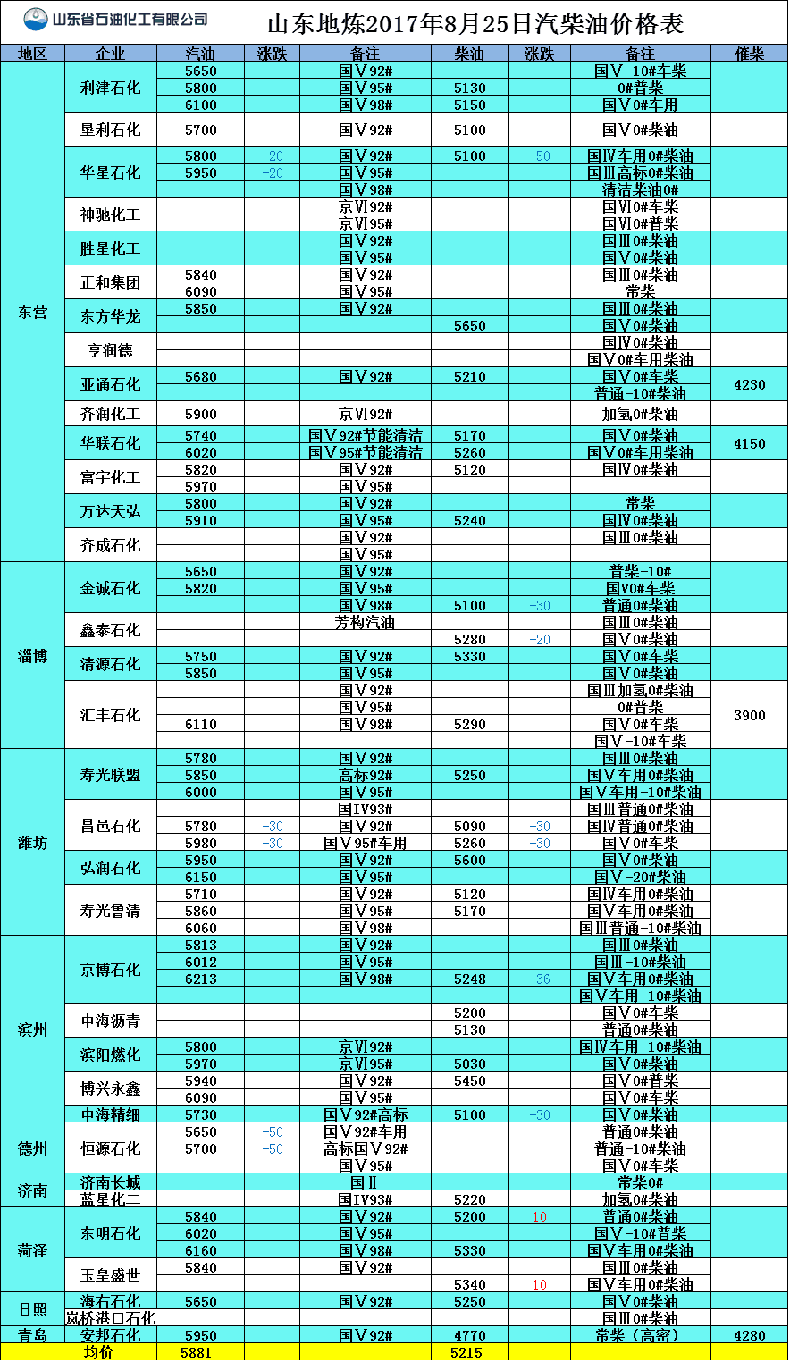 山東地煉2017年8月25日汽柴油價格表
