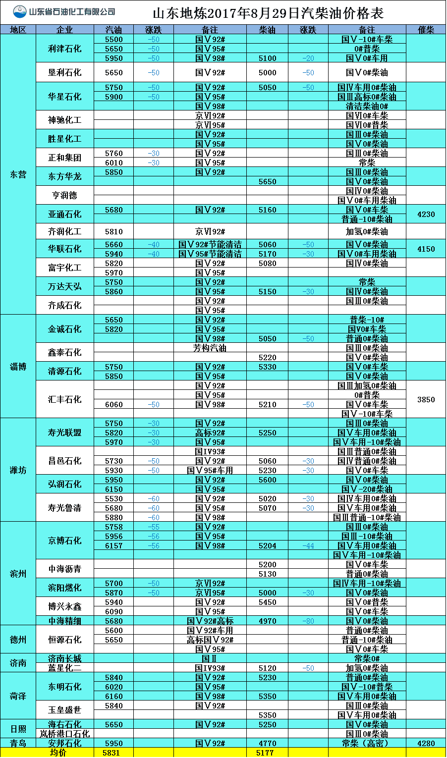 山東地?zé)?017年8月29日汽柴油價(jià)格表
