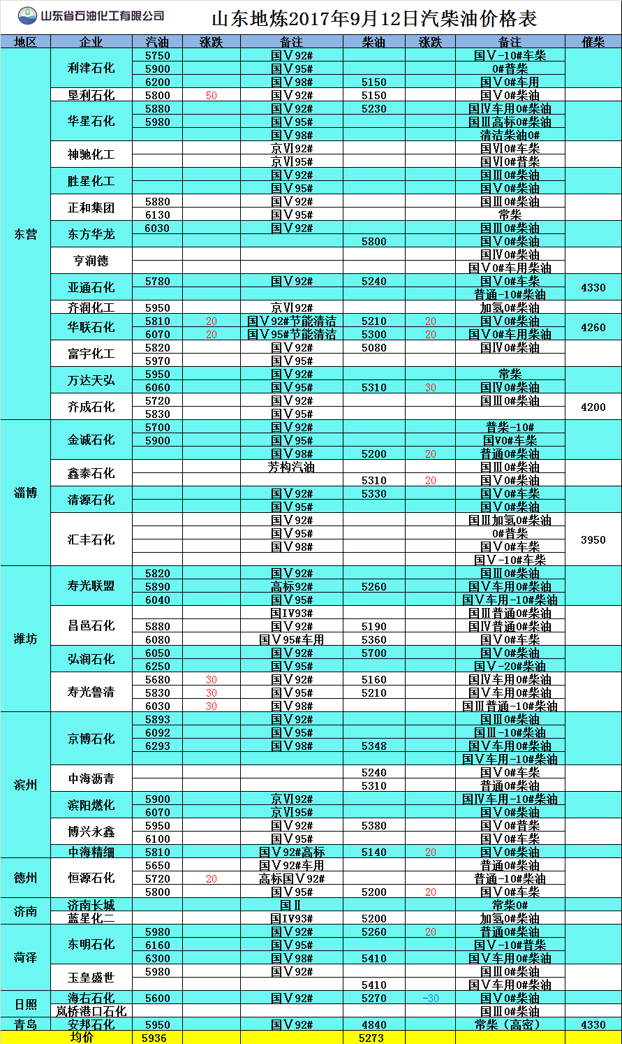 山東地?zé)?017年9月12日汽柴油價格表