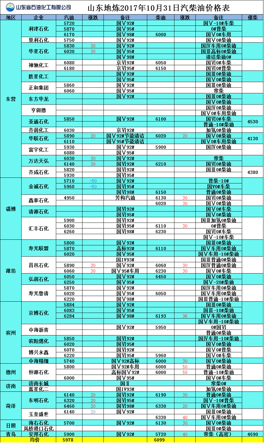 山東地?zé)?017年10月31日汽柴油價(jià)格表