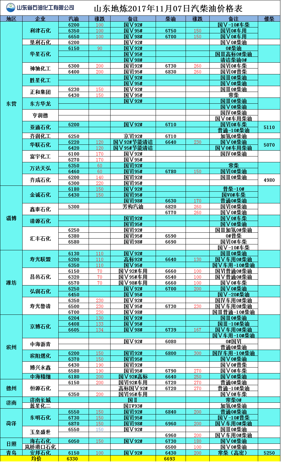 山東地?zé)?017年11月6日汽柴油價格表