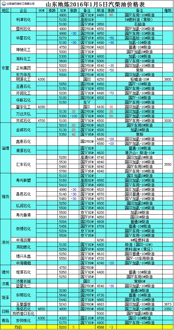 2016年1月5日山東地?zé)捚裼蛢r(jià)格表