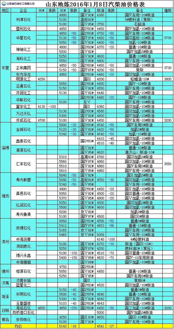 2016年1月8日山東地?zé)捚裼蛢r(jià)格表