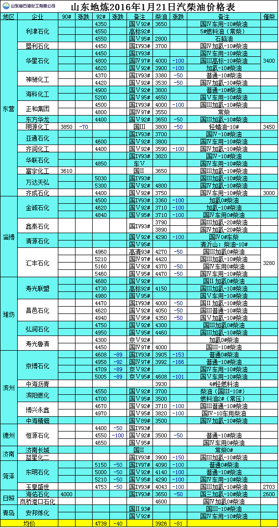 2016年1月21日山東地?zé)捚裼蛢r格表