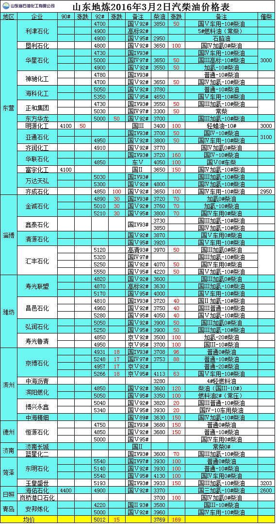 2016年3月2日山東地煉汽柴油價格表
