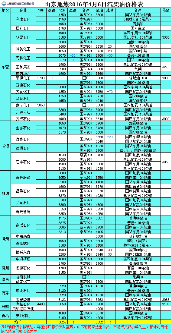 2016年4月6日山東地煉汽柴油價格表