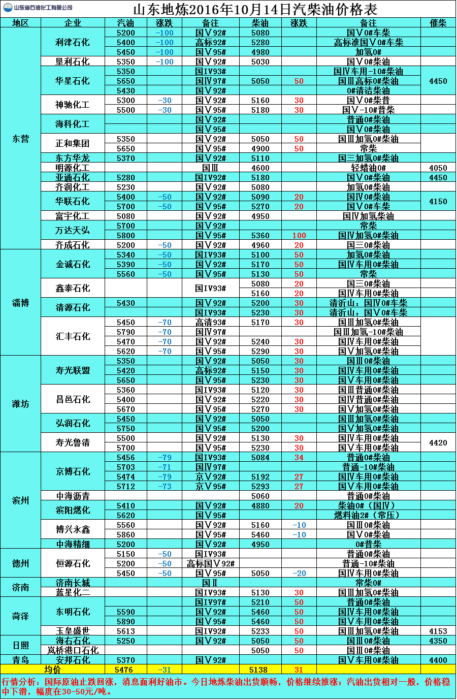 10月14日山東地煉汽柴油價格