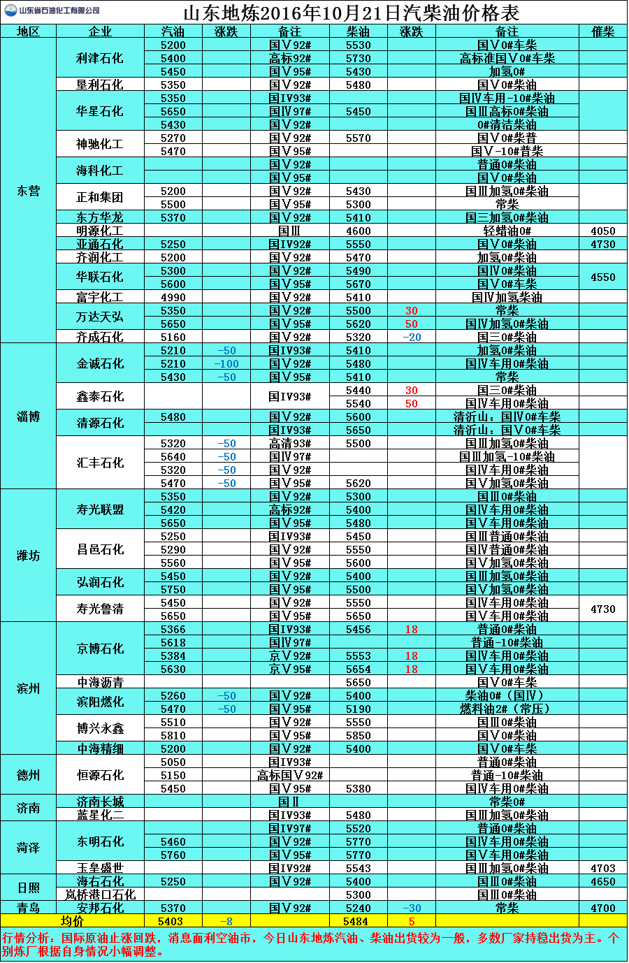 行情分析:國際原油止?jié)q回跌,消息面利空油市,今日山東地?zé)捚?、柴油出貨較為一般,多數(shù)廠家持穩(wěn)出貨為主。個別煉廠根據(jù)自身情況小幅調(diào)整。