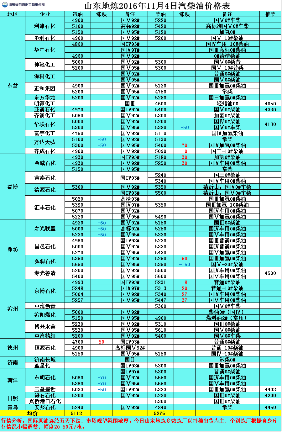 11月4日山東地煉汽柴油價格