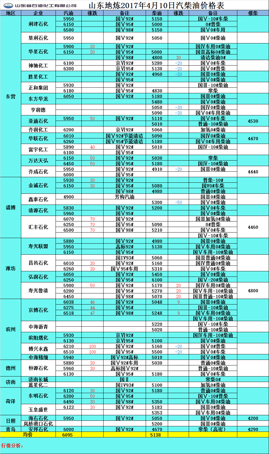 2017年4月10日山東地煉汽柴油價格