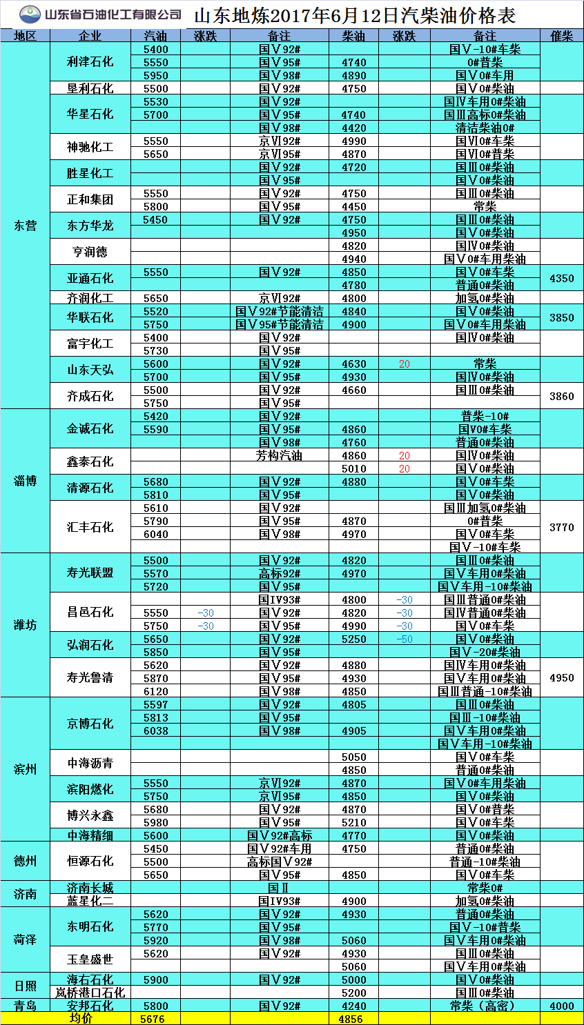2017年6月12日山東地煉汽柴油價格