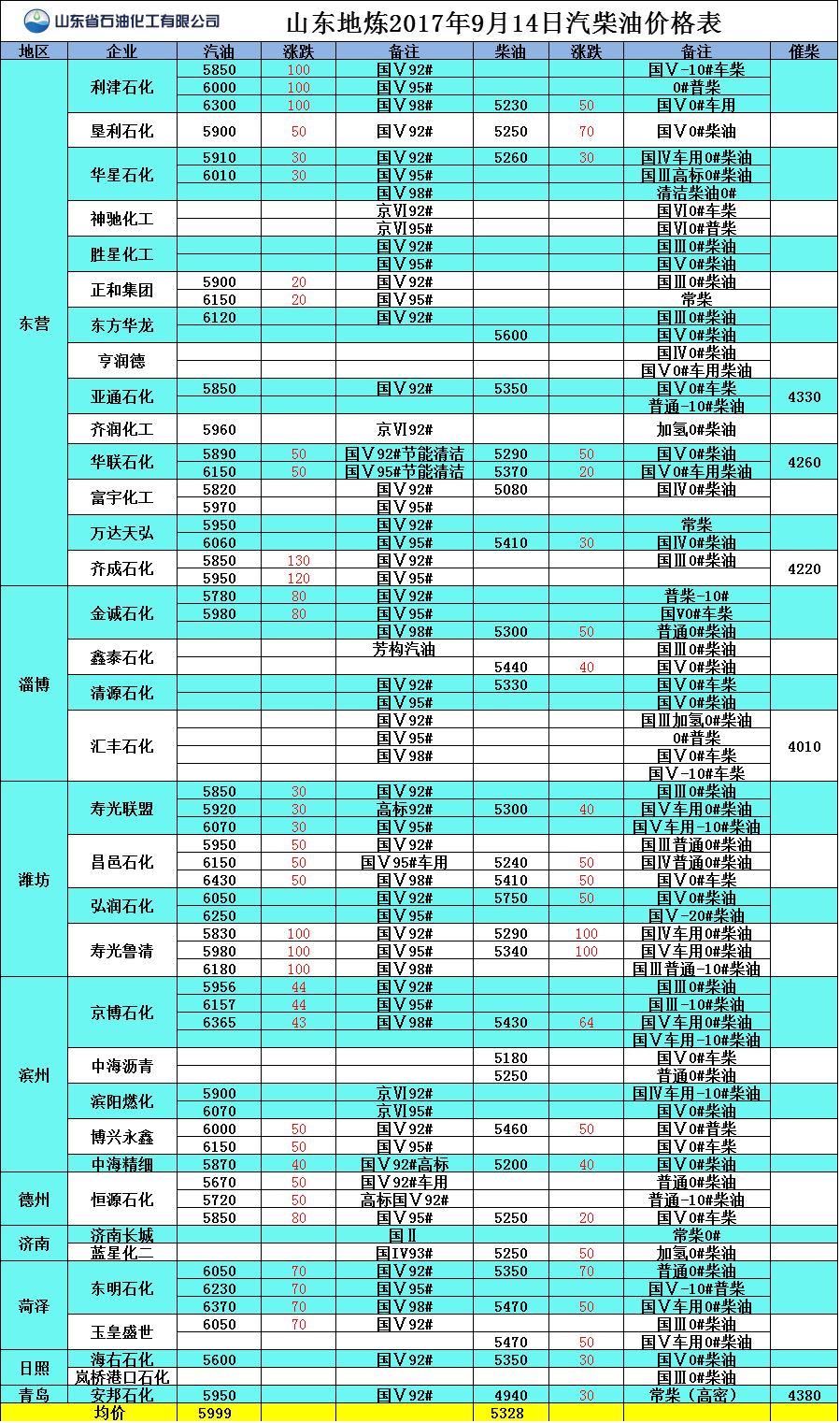 山東地?zé)?017年9月15日汽柴油價(jià)格表