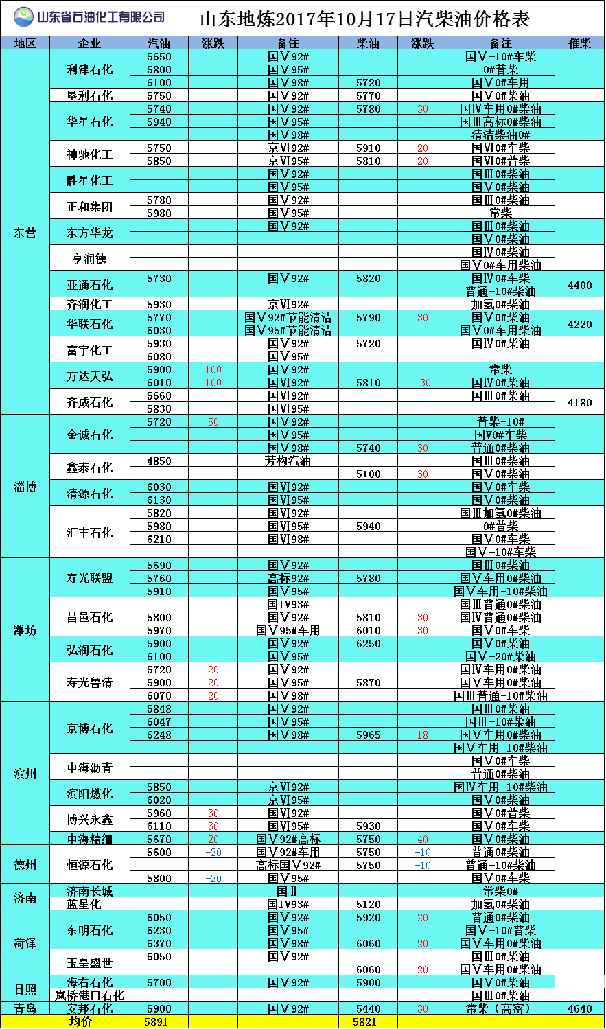 山東地?zé)?017年10月18日汽柴油價(jià)格表
