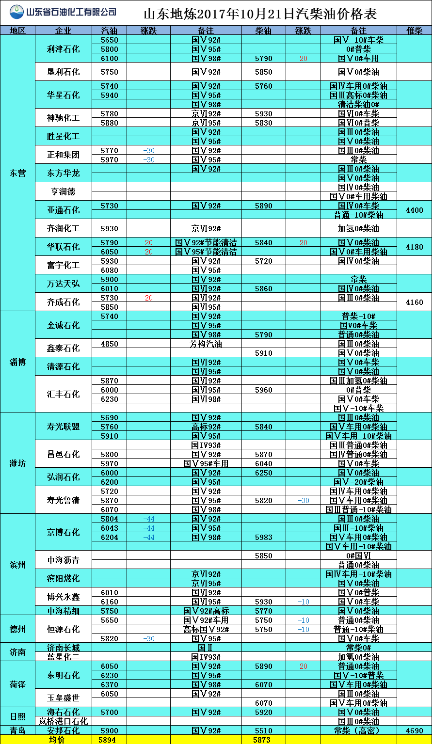 山東地?zé)?017年10月20日汽柴油價格表