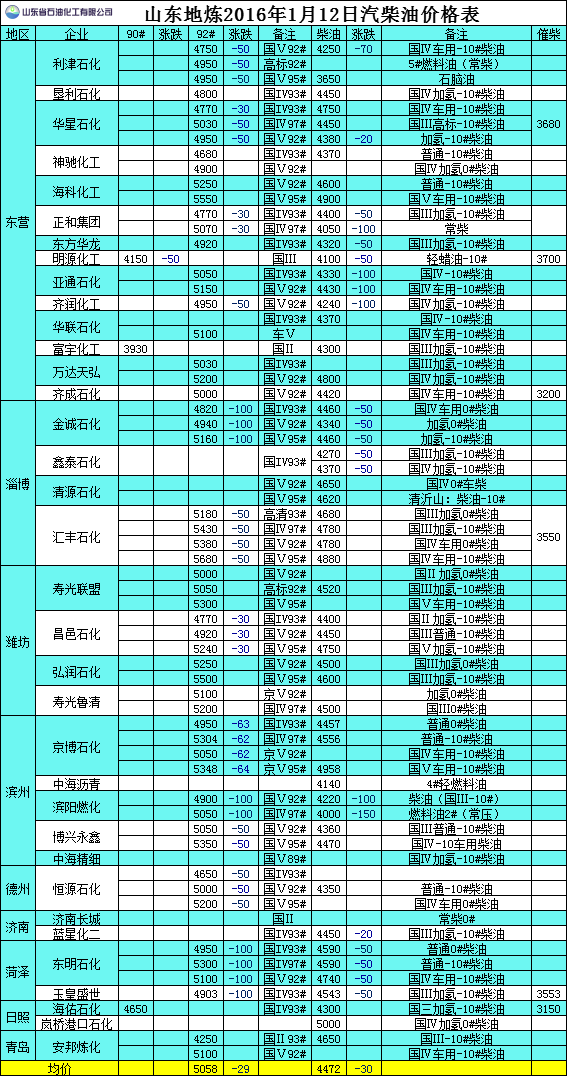 2016年1月13日山東地?zé)捚裼蛢r格表