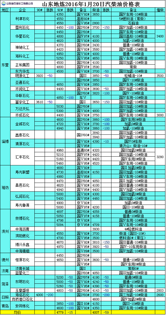 2016年1月20日山東地?zé)捚裼蛢r(jià)格表