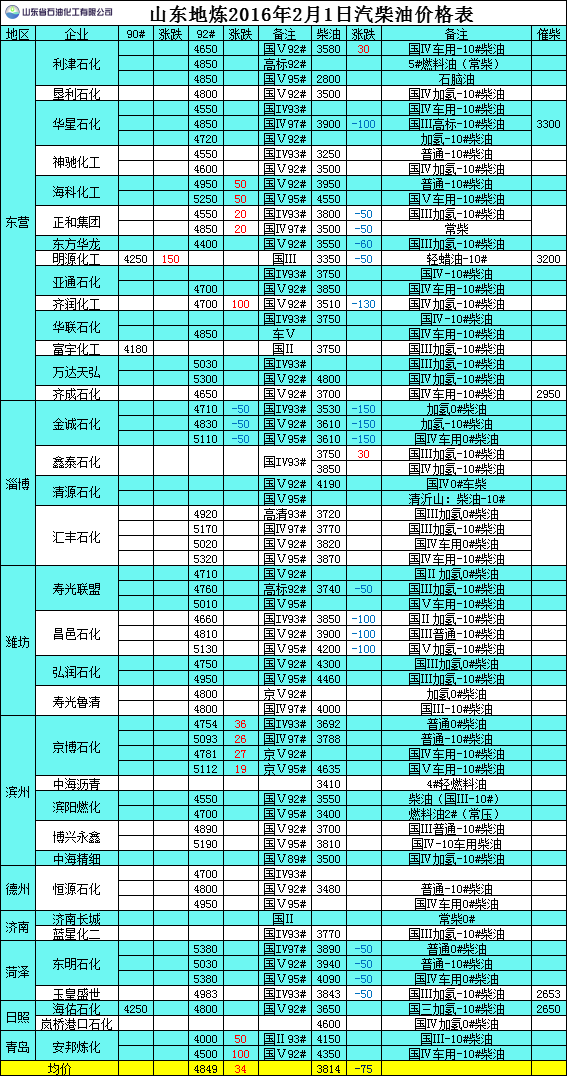 2016年2月1日山東地?zé)捚裼蛢r格表