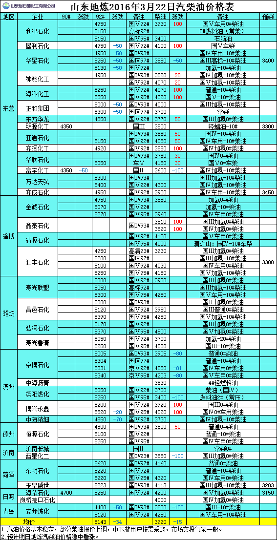 2016年3月22日山東地煉汽柴油價格表
