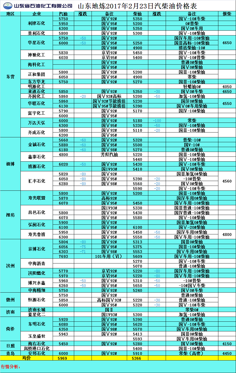 2017年2月23日山東地煉汽柴油價格